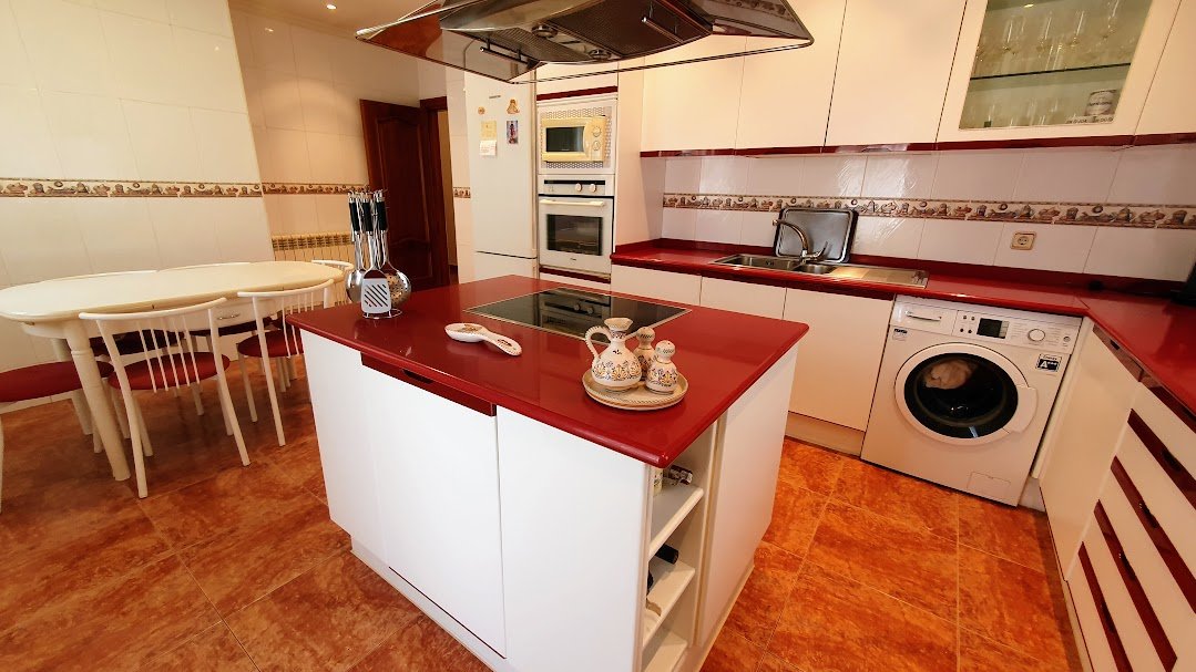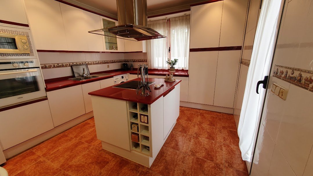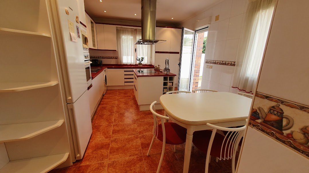 La vivienda se organiza en torno a un amplísimo salón con grandes ventanales, chimenea con casette y aire acondicionado, con acceso directo al exterior. La cocina, muy espaciosa y funcional, cuenta con isla central y salida a la parte posterior de la finca.